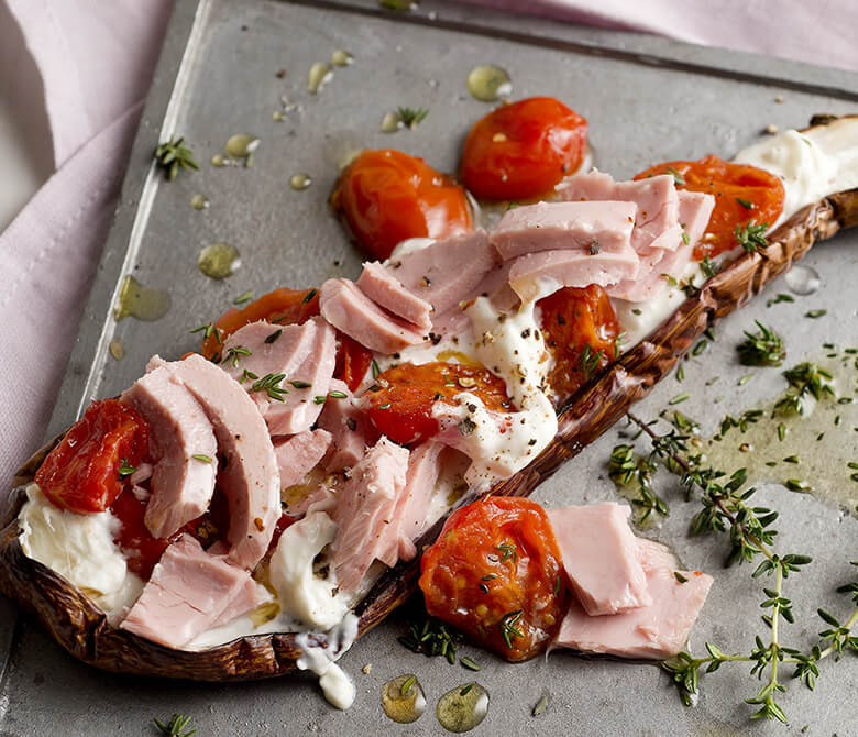 3. Vágd félbe a hámozatlan padlizsánokat, és rakd ki őket a tányérra.Add hozzá a stracciatella sajtot és a paradicsomokat, ízesítsd kevés olajjal, sóval és borssal, helyezd rá a tonhalat és már tálalhatod is.